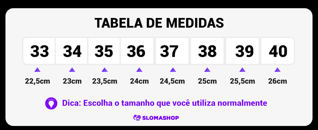 Recomendação: Escolha o tamanho adequado de acordo com a numeração que você usa.